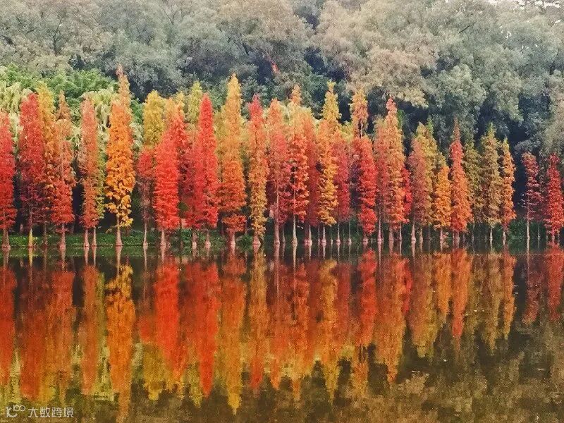 湖边种植着古稀树种——水杉树,每年秋冬之际,水杉树叶从翠绿、金黄、渐变到橘红,给常年葱郁的森林公园添一丝柔美、一抹亮色。