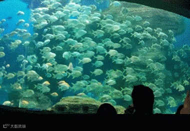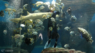 在海洋剧场13米高的巨型水族展缸前