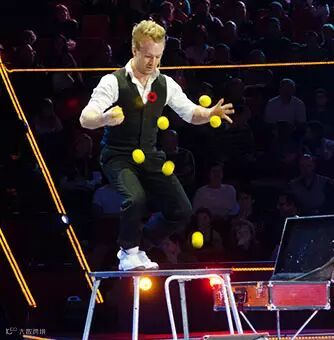 小圆桌,小椅子,五个网球,简单的道具,瑞典马戏演员,却牢牢锁住了现场观众。不知演员施了什么魔法,五个橙黄的网球,服服帖帖,在演员的手掌,桌面,椅面,有序穿梭,但演员根本不满足,用黑色胶布蒙着眼睛,站在椅子上扔接反弹球,观众被眼前的一幕折服了。