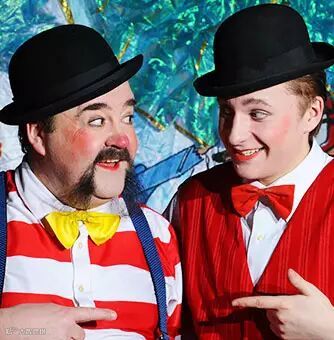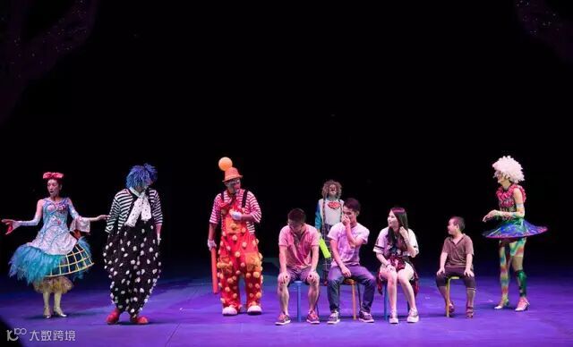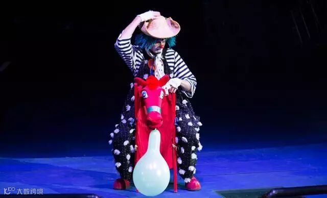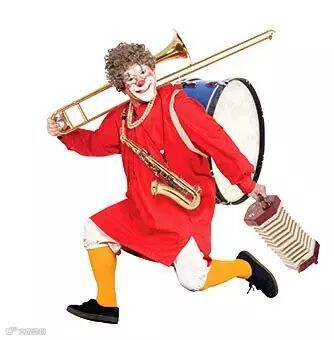 两位小丑演员随着音乐节奏夸张扭动身躯跳着舞进场,小提琴、琵琶、萨克斯,架子鼓与踢踏舞。一气呵成,特别是年长人小丑,用架子鼓,敲打着架子鼓,从小型架子鼓到大型架子鼓,直到架子鼓被一件件撤走,干脆用鼓架敲打舞台上的木板,鼓架被抢走,继续用脚踢踏地踏着木板。场面非常滑稽,引人发笑。