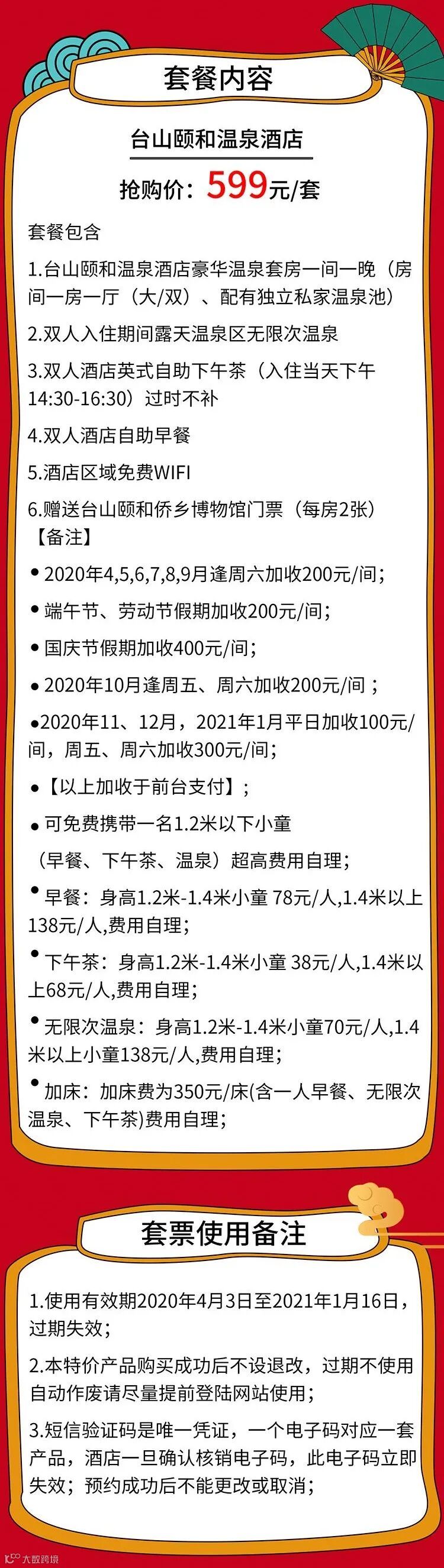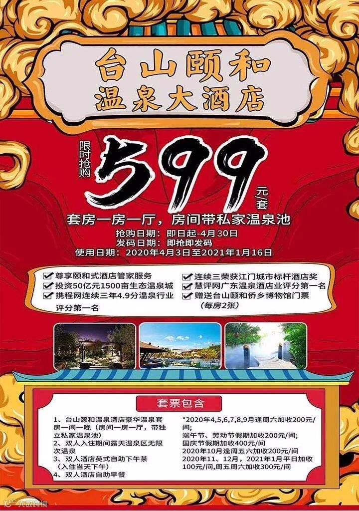 ¥599抢台山颐和温泉大酒店带私家温泉池一房一厅套房,数量有限,售完即止!!