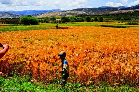 秋天的青稞呈现金色。青稞是藏族人民的主要粮食,生长在海拔4200~4500米的青藏高寒地区,是西藏四宝之首糌粑的主要原料。