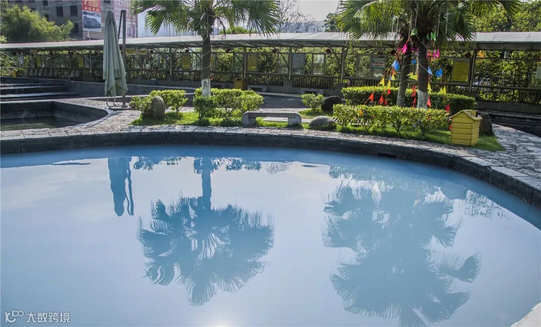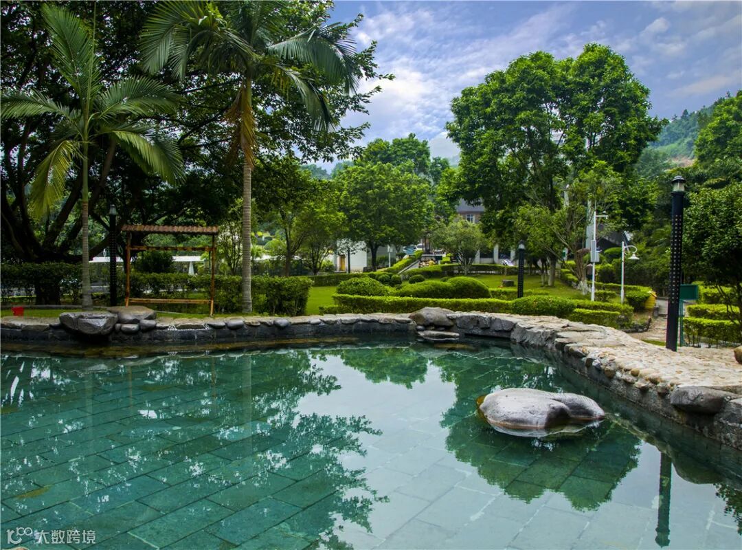 户外露天温泉池,周边绿树环绕