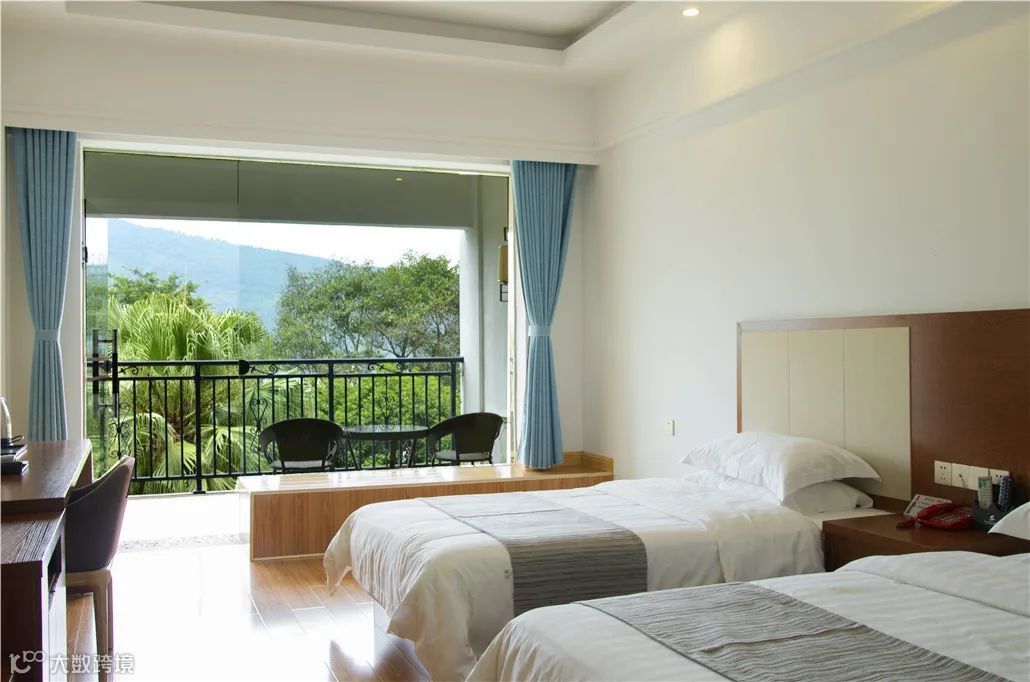 温馨舒适的房间是酒店的标配,搭配独具韵味的艺术摆件、开阔的山间美景。大大的落地窗,推门出去,庭院里绿意正旺。