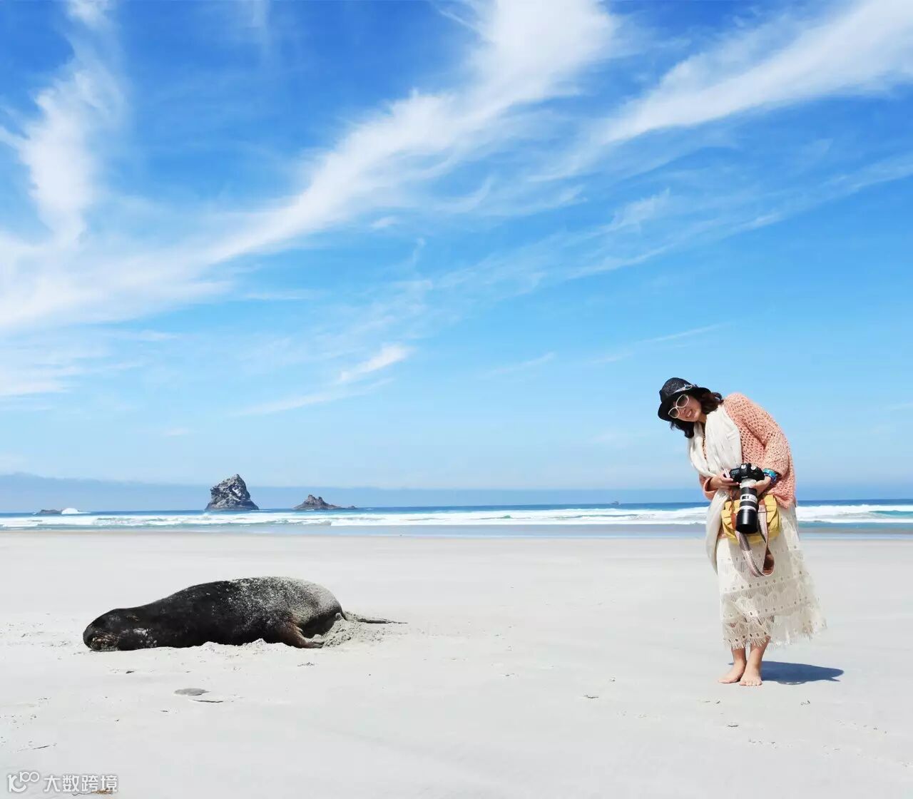 “新西兰奥塔哥半岛的Sandfly Bay,延绵沙丘之下是海天一色清透心扉的蓝,在这里可以与体型巨大的野生海狮亲密接触!”