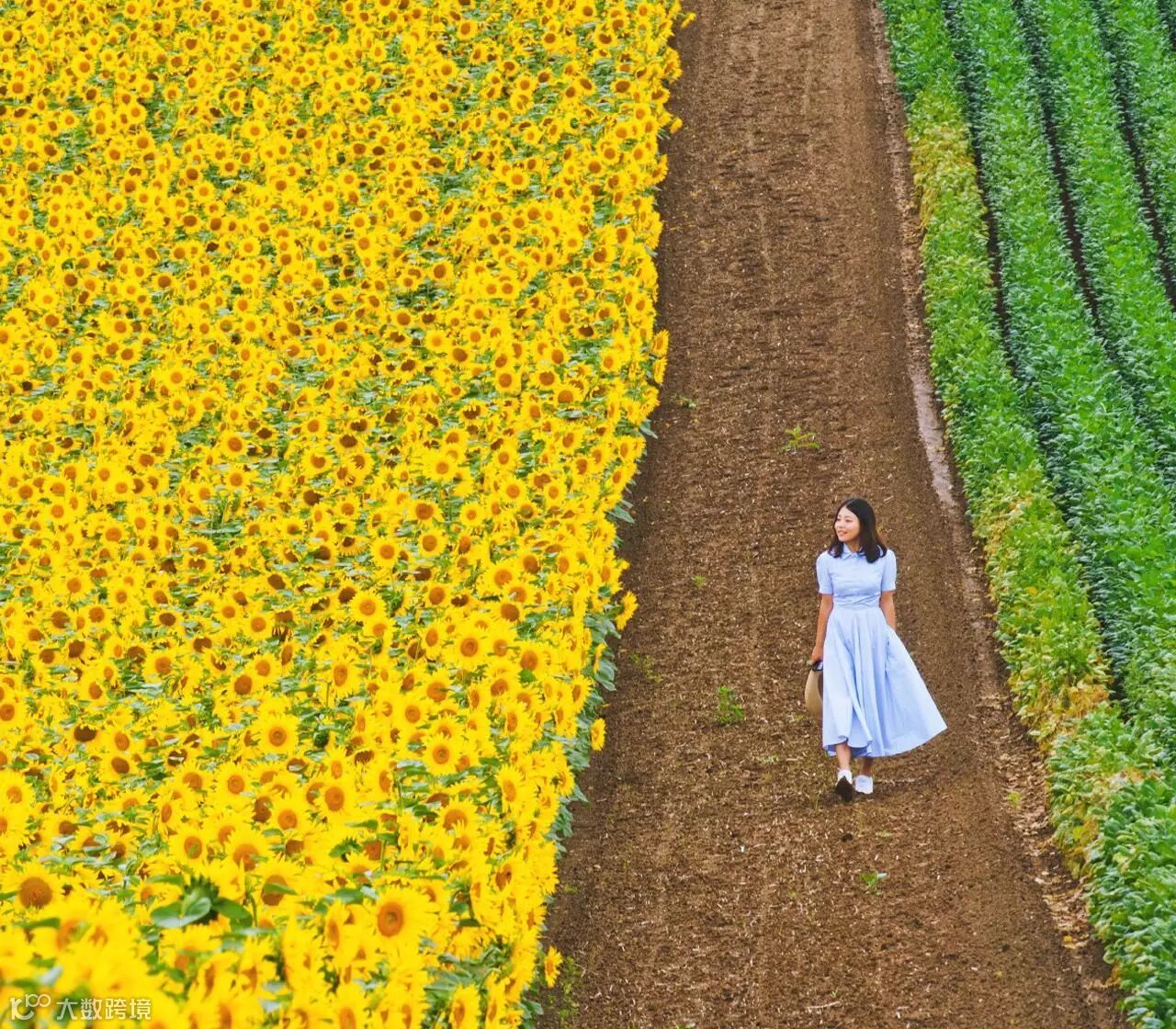 “踩着脚踏车穿梭在北海道的丘陵之间,遇见梦想的生活场景:独栋木屋、参天大树、绵延起伏的向日葵美的那么不真实,它们仰望着太阳而绽放,向着阳光而微笑。”
