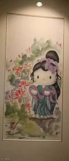中国传统四大美人的壁挂画换成了Hello Kitty。水墨画Hello Kitty扮演四大美人,颇有喜感。这个“西施浣纱”的造型很惹人喜欢,圆面也可以是美人胚子!