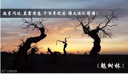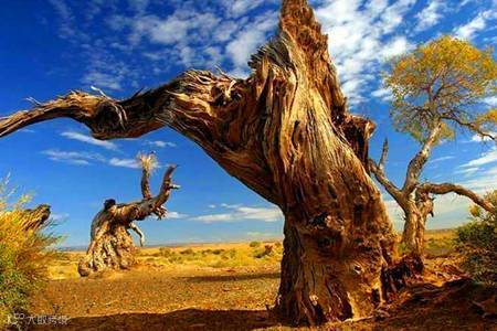 胡杨林是大自然之神奇所造就,站在这铮铮铁骨前,似乎时间都凝滞了。任凭沙暴肆虐,任凭干旱与盐碱的侵蚀,任凭严寒和酷暑的打击,即使枯竭,也要展现它顽强的美。“死而千年不倒、倒而千年不朽”,额济纳胡杨林景区的魅树林正向世人倾诉着自己的宝贵的千年生命竟戛然而止,虽亦悲凉,但也是正以另一种精神感召着生命的传奇。