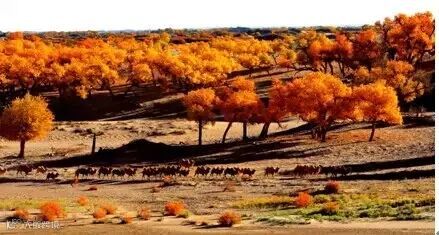 如果爱一个人,就带她去看内蒙古额济纳的秋天,因为那里的大漠胡杨林就是美景的天堂。额济纳是世界上仅存的三大胡杨林地之一,最负盛名的是金秋胡杨的美景。每年国庆前后十天左右,便迎来当地赏胡杨的最佳时节,一眼望去,阳光下金色的树叶衬着湛蓝的天空婆娑起舞,气势动人。到了额济纳旗达来呼布镇西南28公里处的怪树林,又是另一番景致。你会发现,大片枯死的胡杨树干依然挺立,形态怪诞,竟是一种震人心魄的极致之美,仿佛走进了一片虚幻小说里的怪诞迷城。