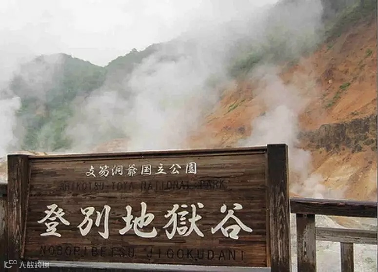 (适逢樱花时节,游人可以欣赏到浪漫樱花)地狱谷是位日本北海道登别市的一个火山口遗迹,被视为登别的象征。它邻近洞爷湖,大约在一万年前形成,是火山爆发后,由融岩所形成的一个奇形诡异的谷地,灰白和褐色的岩层加上许多地热自地底喷出,形成特殊的火山地形景观。地狱谷至今仍有直径大约450米的地方在喷冒着白烟。