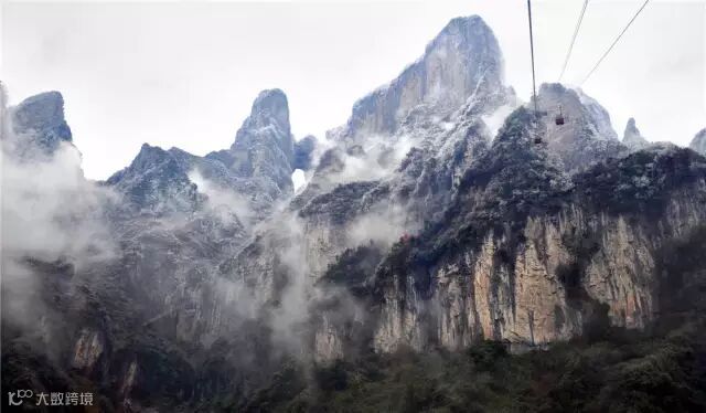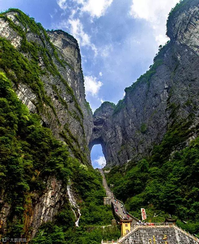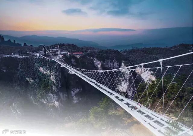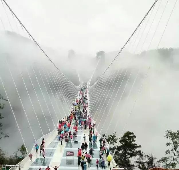 张家界十大绝景之一天下第一桥。横跨两山之间,雄伟壮观。俯首桥下,但见白云飞渡,奇峰林立。世界第一梯--百龙电梯,体验百龙电梯,人生太多第一