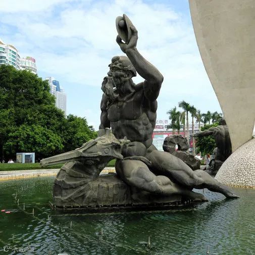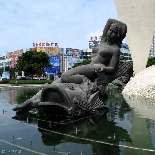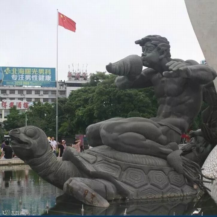 水池内环绕主碑体周围有三组造型独特的雕塑群,分别是骑承海鱼的珠女、骑承海龟的青年渔民和骑承海马的渔翁。