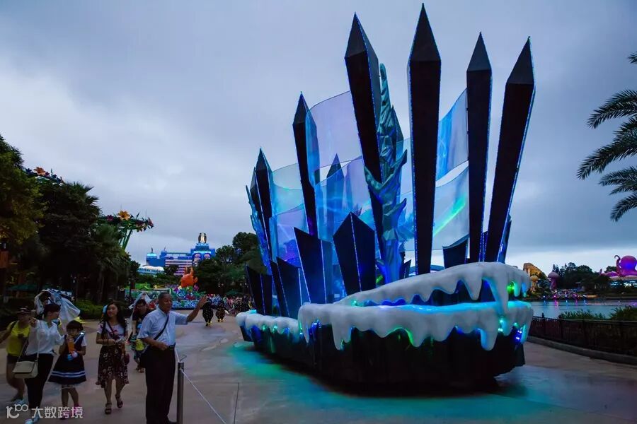 海洋夜光大巡游有八个主题,不同主题的花车会设计不同的装饰与灯光。如极地主题的花车会散发出凛凛蓝光,花车车身缀以雪地和冰柱。在夜幕的衬托下,花车折射出熠熠光彩,令人惊艳。