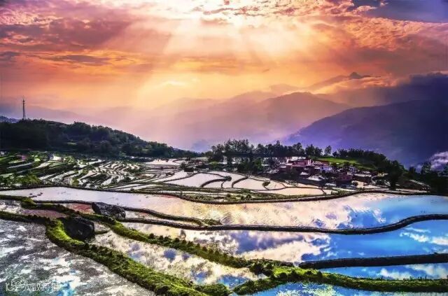 滇中唯一的以梯田景观著称的地方,属红河哈尼文化走廊的上游地段。傍晚的天空,色彩变换,从橘黄到玫瑰,再至紫色、蓝灰。沅江之畔的各组村寨,掩映在夕阳的树影中,不约而同,依稀炊烟袅袅升起。