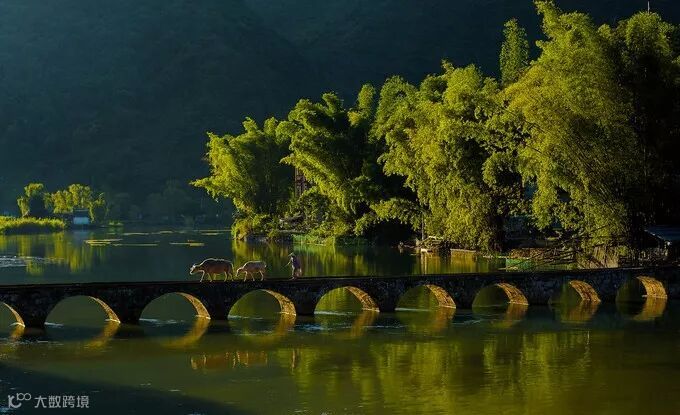 辛勤劳作一天的牛群,走在洒满光晕的石桥上