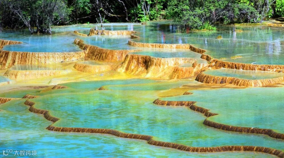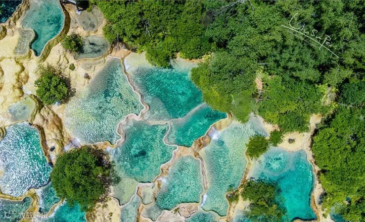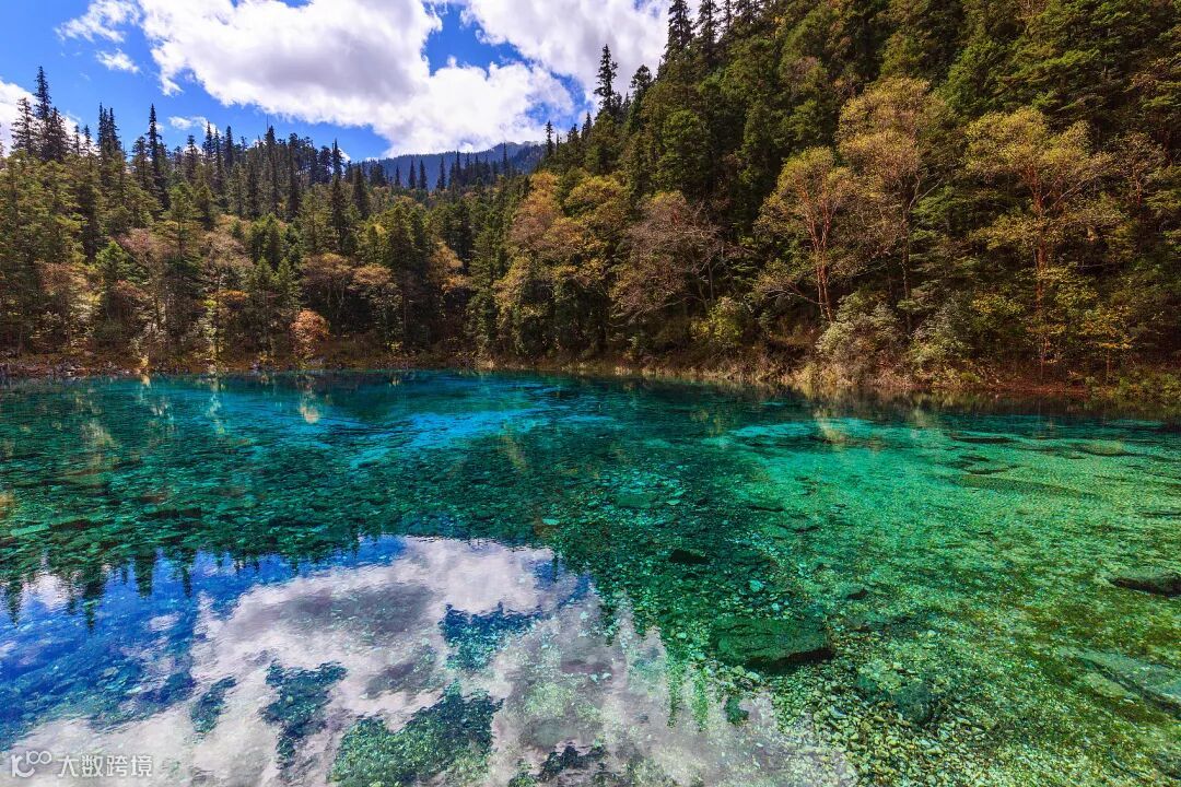 由于水底的钙华沉积、各种色泽艳丽的藻类以及岸边的林木倒影,使得五花海呈现出鹅黄、藏青、墨绿、宝蓝等各种颜色。