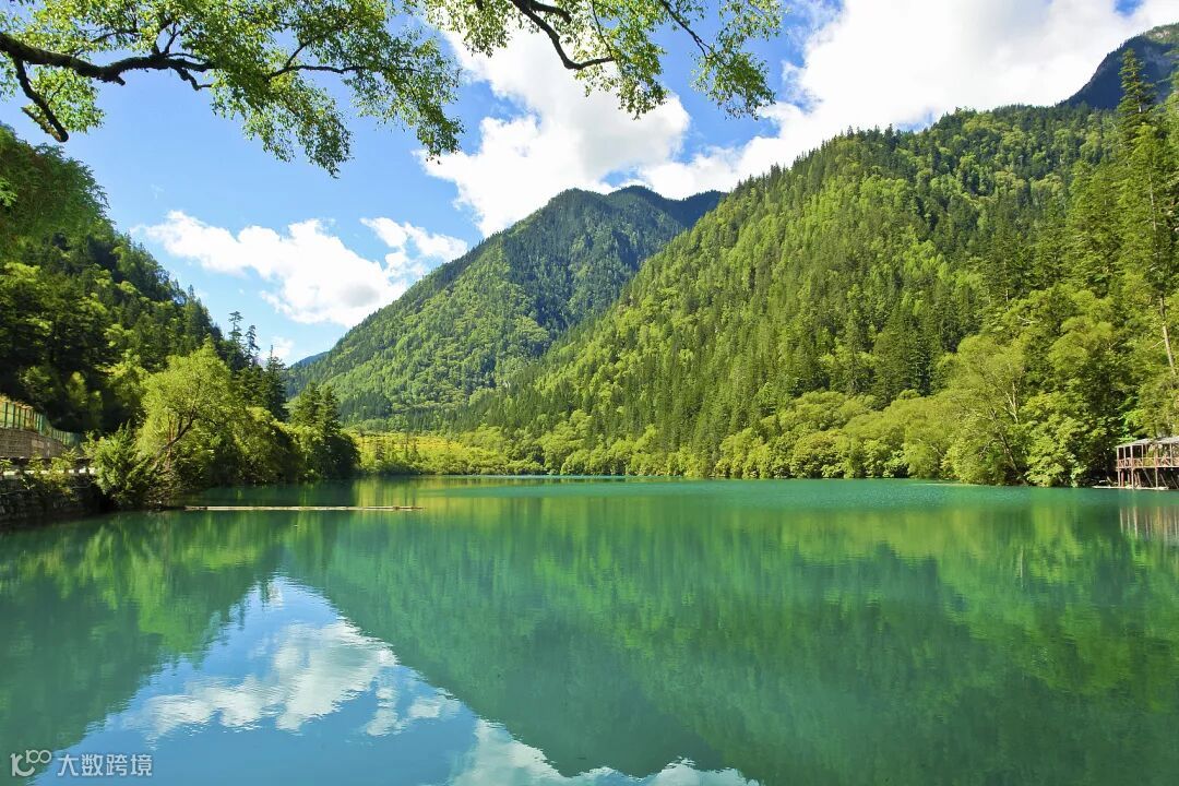 九寨沟镜海紧邻在空谷的下游,湖呈狭长形,长约一公里,为林木所包围。