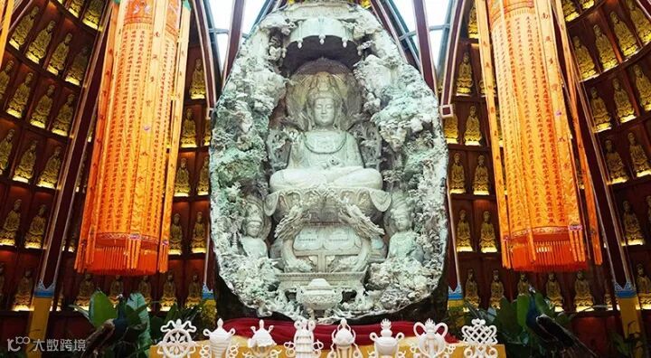 此尊圣像高5.3米,宽3.8米,厚2.7米,由重逾百吨的翡翠原石雕琢而成,材质温润细腻,色泽奇彩多样,翠绿衬绕,乃天降之物。