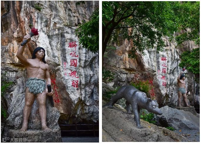 狮子岩的狮头峰也称前山,它是狮子岩的核心景点,马坝人头盖骨化石就是在这里发现的。银岩内还陈列了展示马坝人在约十三万年前洞居生活的塑像