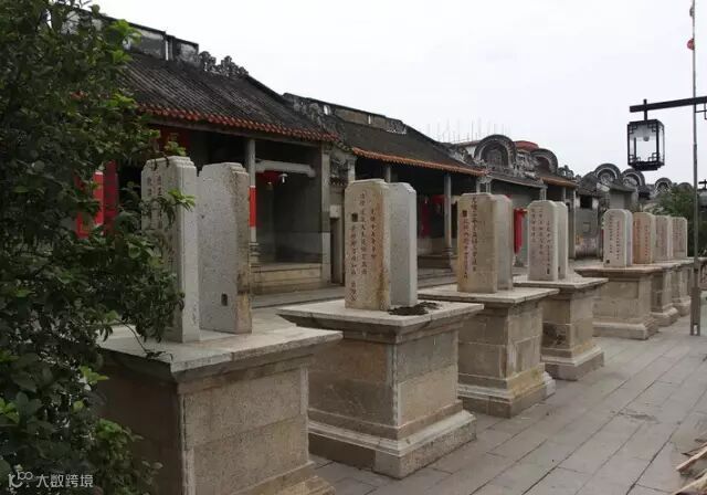 左侧祠堂整齐排立,自西至东有区氏大宗祠、大夫家塾、六世祖祠、东山祖祠、樵侣祖祠、世大夫家庙、和存石祖祠等,所幸逃过了历代劫难,保存基本完好。那青砖磨砌、精致雕饰和沿塘并立的旗杆夹石,无不彰显村人祖辈的辉煌,给后人以莫大的激励。