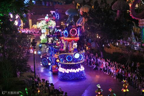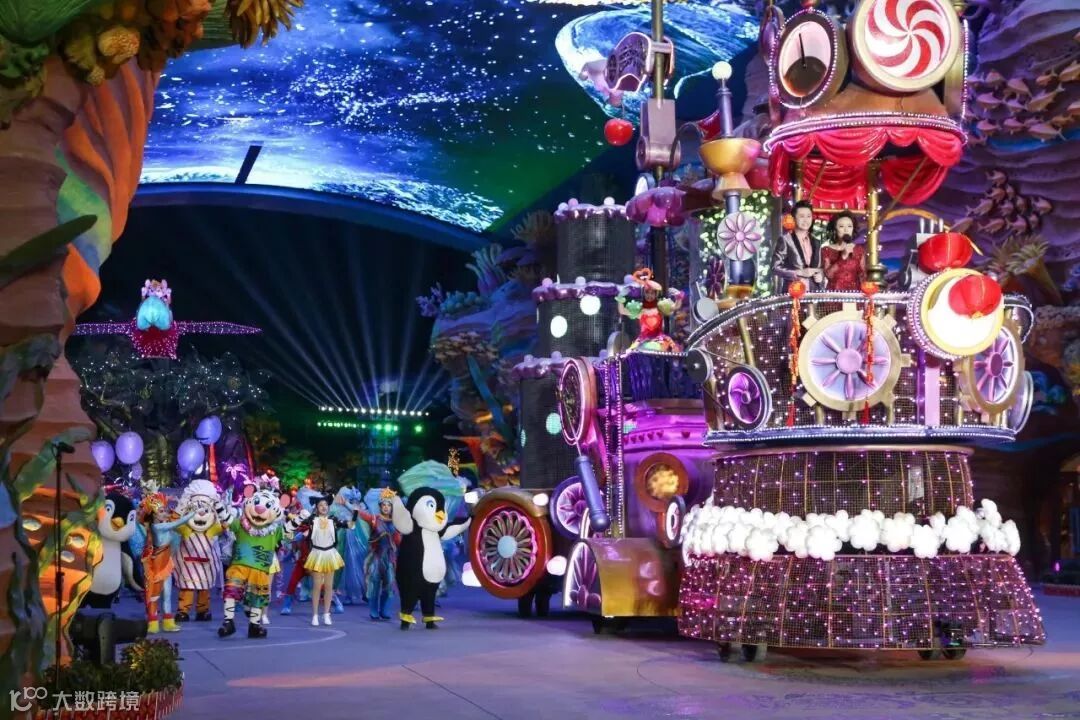 海洋夜光大巡游有八个主题,不同主题的花车会设计不同的装饰与灯光。如极地主题的花车会散发出凛凛蓝光,花车车身缀以雪地和冰柱。在夜幕的衬托下,花车折射出熠熠光彩,令人惊艳。