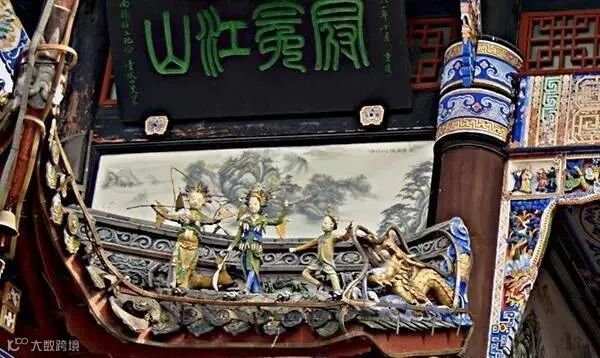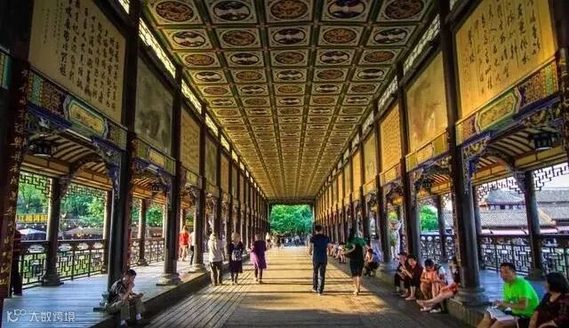 桥头上重檐彩塑珍禽奇兽和各种民间传说戏剧人物情态各异,栩栩如生。