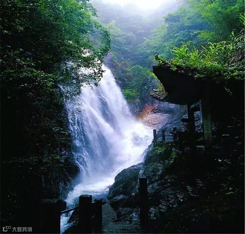 矗立于原始森林间的瀑布,水流经风一吹,扬起无数水星