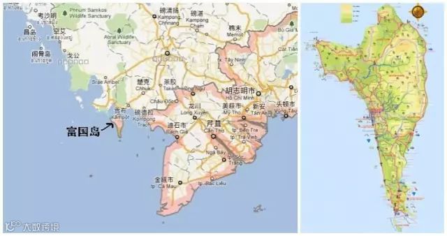 北距柬埔寨南岸波哥11公里,东距越南南部西海岸69公里。南北长约48公里,东西最宽处达27公里,面积596平方公里。东半部从北部的海拔600米降至南部的366米,西半部及南端地势较低,部分岛域为森林覆盖。