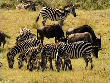 斑马为非洲特产,约30 万头左右,最喜欢吃草茎顶部。