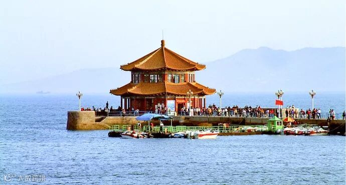 青岛著名的地标建筑,长长的栈道由海边向海面延伸