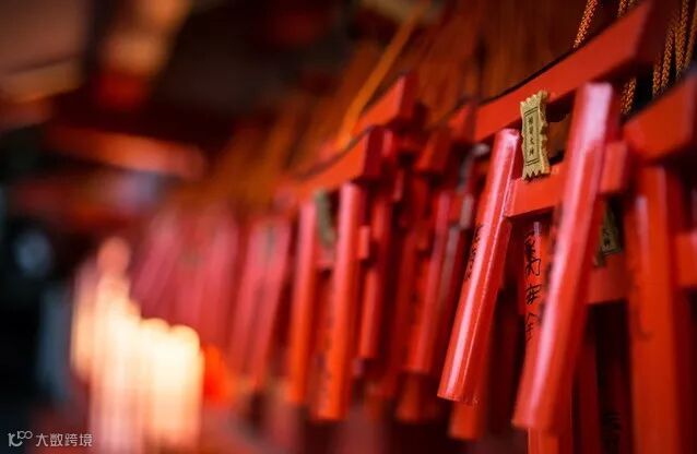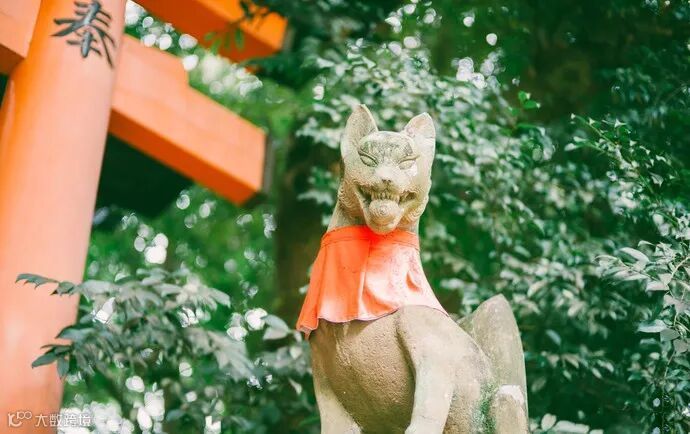 伏见稻荷大社的入口,矗立着由丰臣秀吉于1589年捐赠的大鸟居,后面便是神社的主殿及其他建筑物。在神社里,还能见到各式各样的狐狸石像,这是因为狐狸被视为神明稻荷的使者。狐狸脸形的绘马是这里的一个特色,这个形象女孩子看到都会双眼冒桃心的吧!