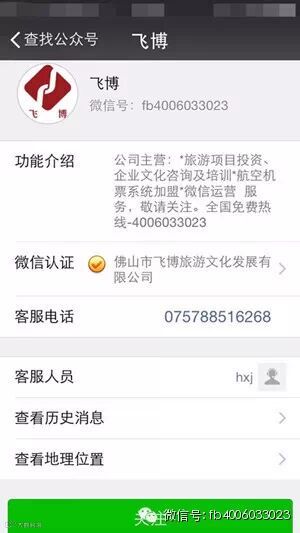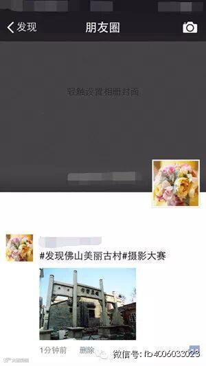 发表原创微信(统一标签#发现佛山美丽古村#摄影大赛……+参赛作品)到朋友圈,同时关注微信公众号“飞博(微信号:fb4006033023)”(如图5),并发送前面所述的朋友圈截屏图片到“飞博”公众号。