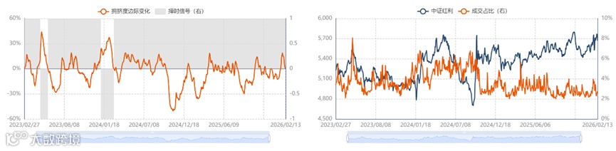 中证红利指数股息率约为4.86%,从景气度、波动率和股息率三维度打分模型来看,红利风格里面的电力与公用事业、消费者服务、非银打分排名靠前。短期拥挤度来看,当前中证红利指数的成交占比处于历史较低水平,拥挤风险较低。