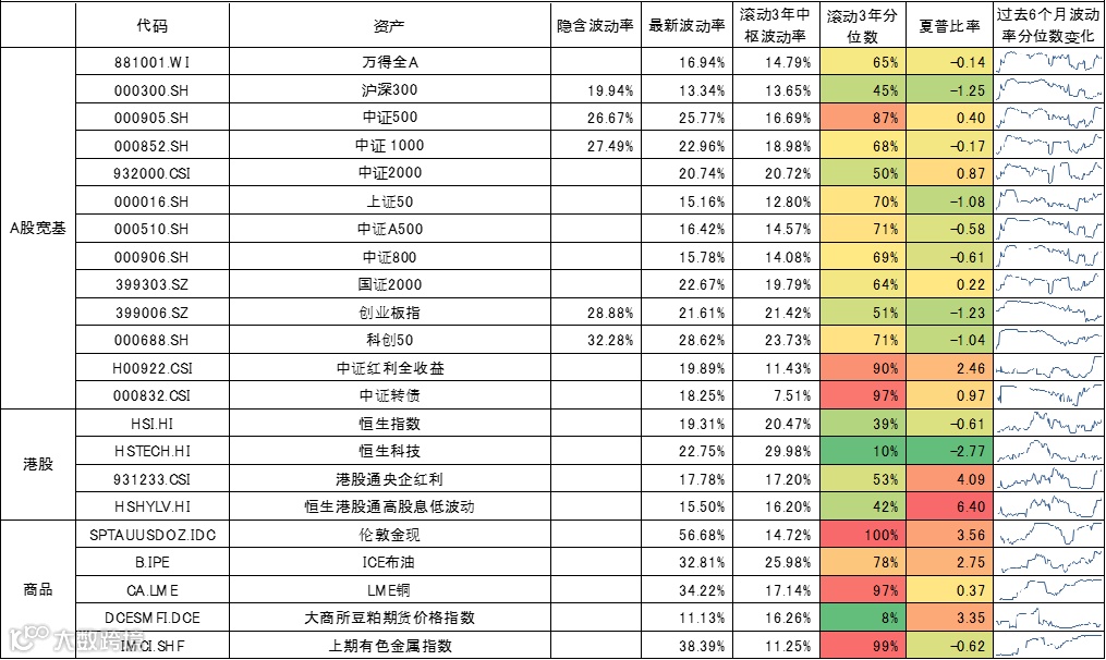 从波动率和隐含波动率水平看,整体风险不算高,以沪深300为例,隐含波动率处于历史中枢水平附近。港股和沪深300指数波动率相对偏低,近期成长价值风格高切低后表现接近,但大小市值风格差异仍较大,从高切低视角看大市值风格可能更值得关注。