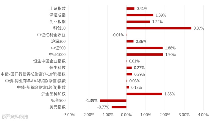 债券&商品市场方面,债市延续涨势,中债7-10国开债指数涨0.29%,中债新综合财富指数涨0.13%。黄金企稳,伦敦金涨1.52%,沪金涨1.85%。
