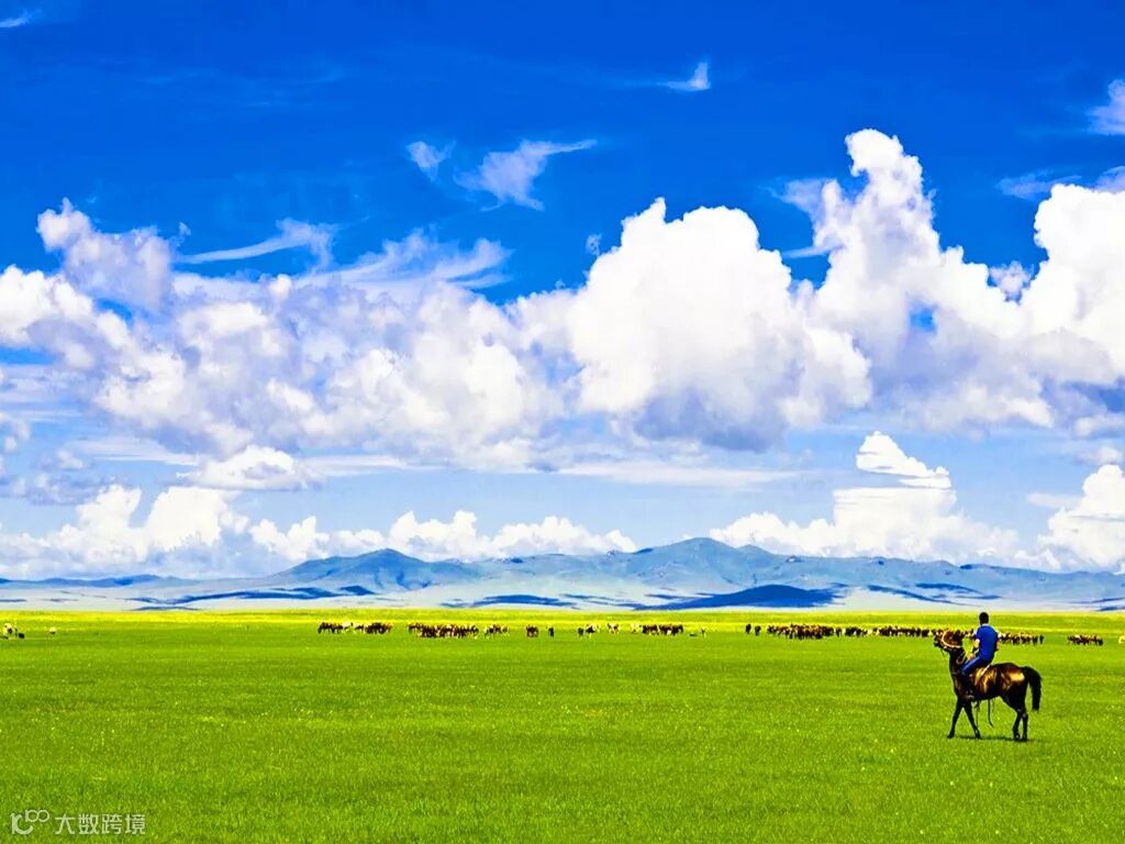 牧民歌唱,骏马奔驰,草原上牛羊、骏马、牧人,再加上零星花朵点缀,构成了一幅极美的画。