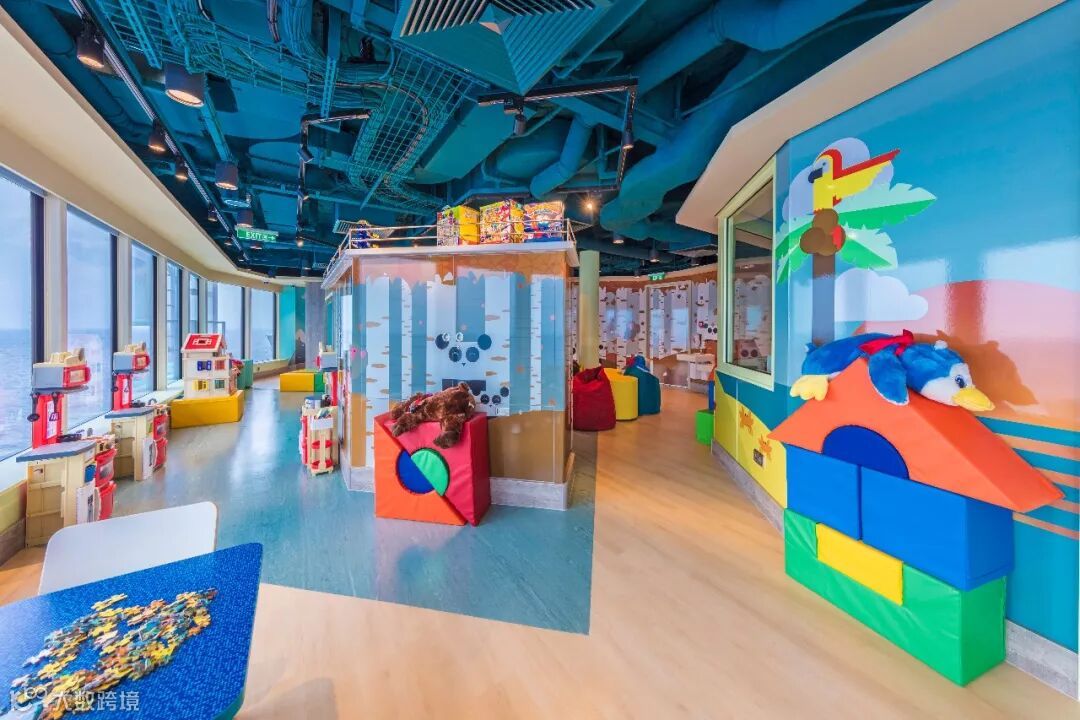 这里有海上最大室内VR游戏区、酒吧、绳索道、攀岩墙、运动场、海上电影院应有尽有。
