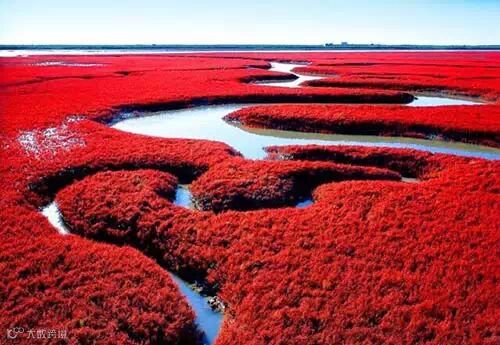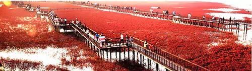红海滩远在入海口的边缘,你必得通过船,才能得以亲近她。在极具艺术魅力的中国园林建筑中,桥是不可或缺的元素。桥文化在中国的传统文化中有着极其重要的地位,赵州河上赵州桥,瘦西湖畔小红桥,昆明湖上玉带桥……每一座桥,都是国人智慧和审美的结晶体。红海滩码头蜿蜒伸展着两座长桥,以及好多连接各功能平台的不规则回廊。你从没有见过这样的桥、平台和回廊——它们由岸边直探进海里,全部建在泥滩上,这是我国惟一一处在泥滩上耸立起来的旅游景点。红海滩的红是它的独特亮点,简直就是红色的海洋,如果是在十月份,颜色更加鲜艳夸张。一片红色的海洋着实让每个到这里的人震撼。