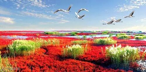 在渤海之滨的这块20多平方公里的湿地苇丛中,栖息着丹顶鹤、黑嘴鸥等236种鸟类。红海滩坐落在赵圈河乡100平方公里的苇田湿地内。它以全球保存得最完好、规模最大的湿地资源为依托,以举世罕见的红海滩、世界最大的芦苇荡为背景,是一处自然环境与人文景观完美结合的纯绿色生态旅游系统。