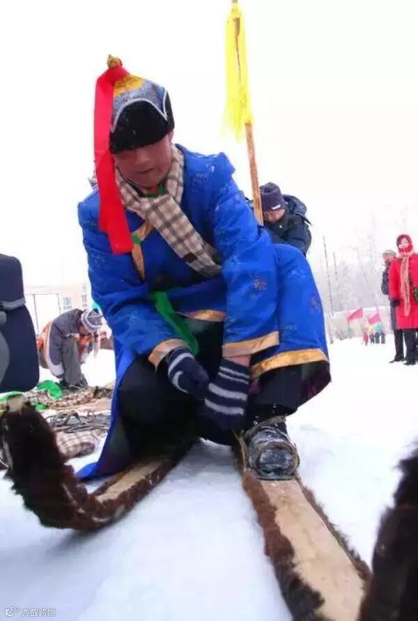 “毛皮滑雪板”又称“察纳”,是当地古老游牧民族发明的一种雪地出行工具,一般用松木制成,整个滑行面用马的小腿皮包裹。在冬季生活中,当地居民至今仍在广泛使用“毛皮滑雪板”。毛皮滑雪板是用松木做板芯,滑行面用马的小腿马皮包裹。马毛的方向朝后,向前滑走时马毛顺茬,增大滑速,向后踩蹬与上坡时马毛逆茬,防止雪板向后倒滑。在古代,马皮与板芯的缝合是用兽皮,如今是用秋皮钉钉在板芯上,除此之外,整个滑雪板上找不到其它金属。