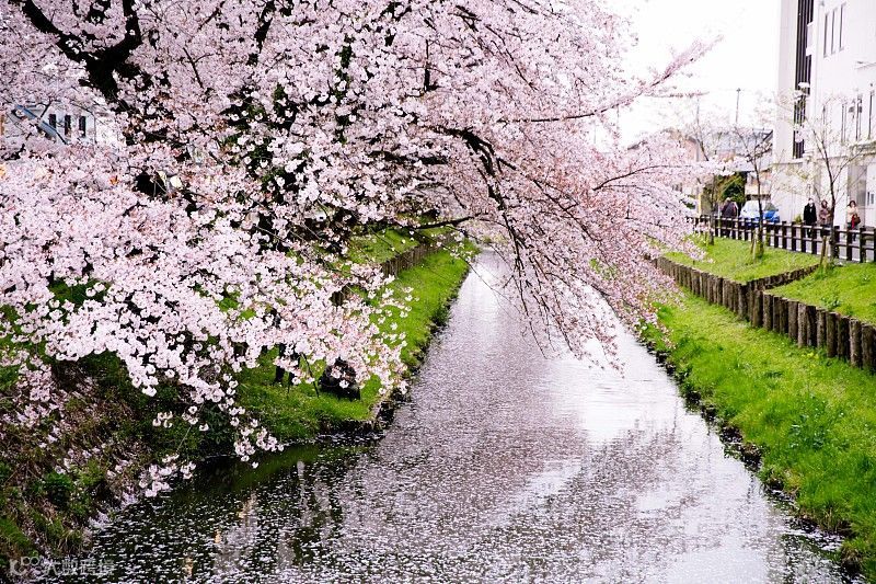 樱花凋落时,河水会被一层花瓣覆盖,成为粉红色,如梦如幻。