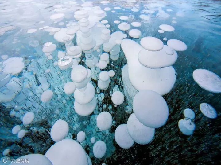 专家称是阳光照射到湖底,温度适宜,生长了许多动植物,植物释放的甲烷气体,在到达湖面被冻结,形成了这一奇景。