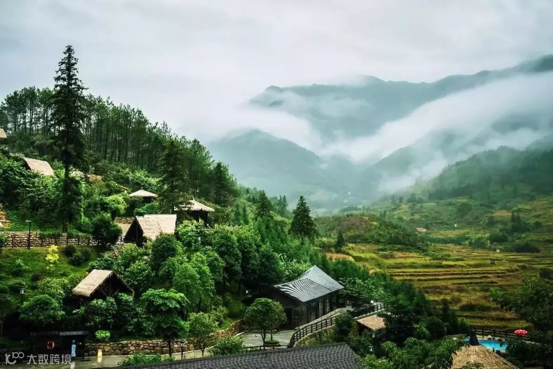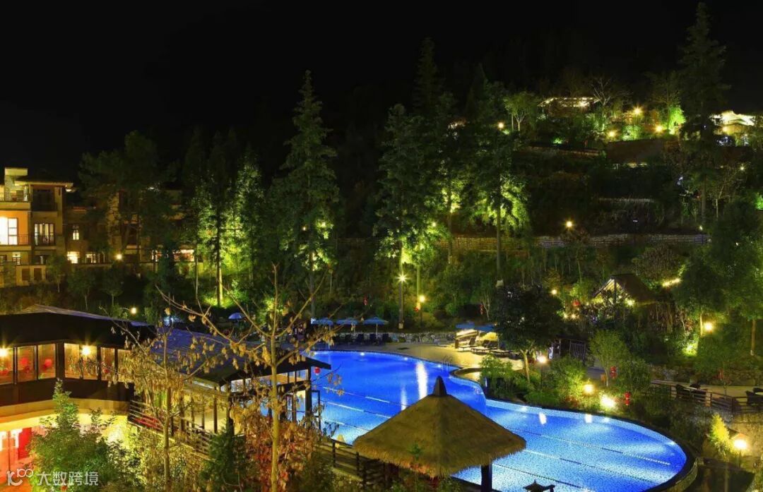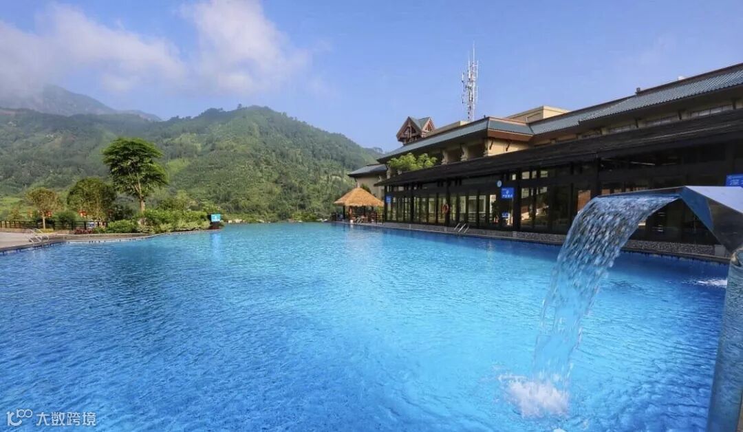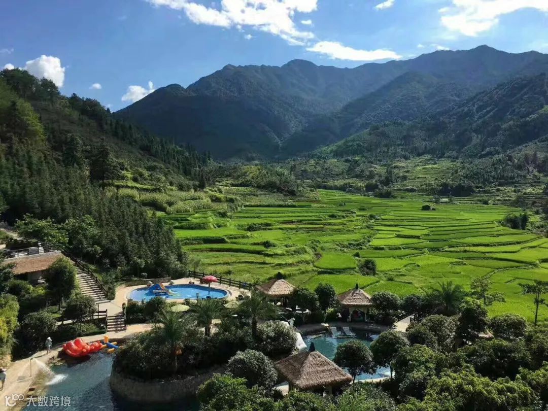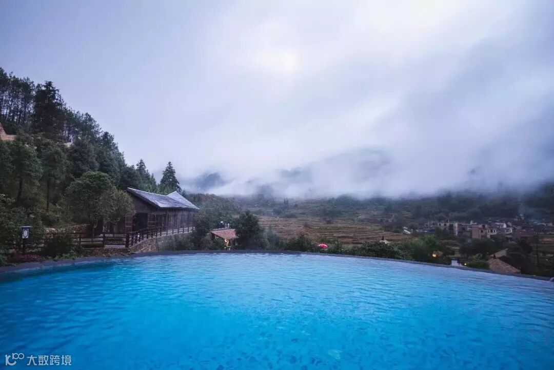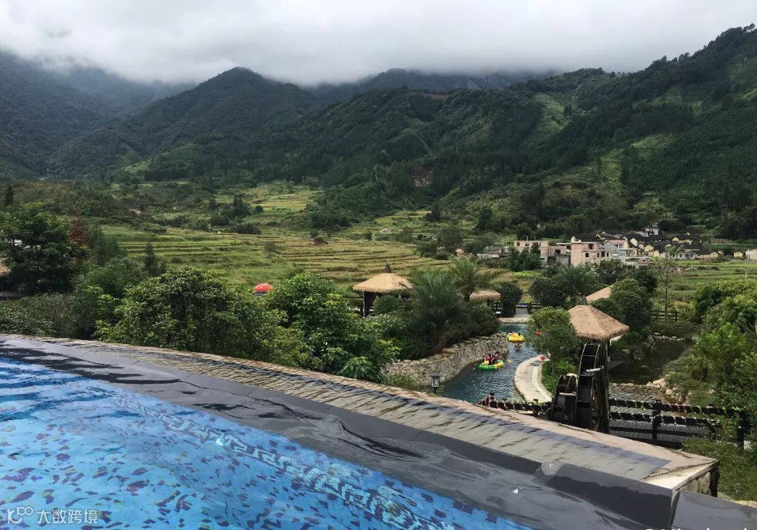 整座度假邨依山而建,毗邻着乡镇的田野,萦绕着雾气,能够让人一边遥望着大山,一边浸泡温泉。
