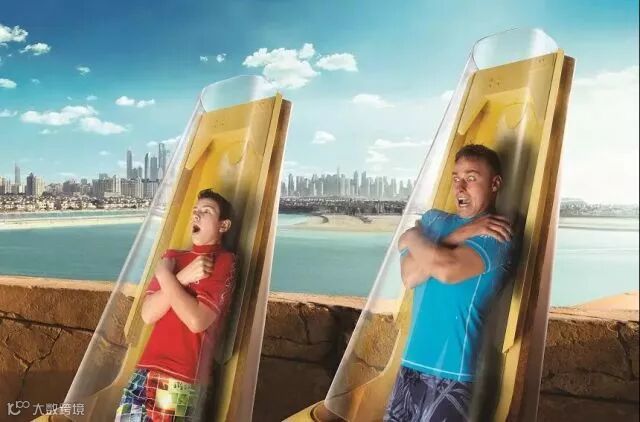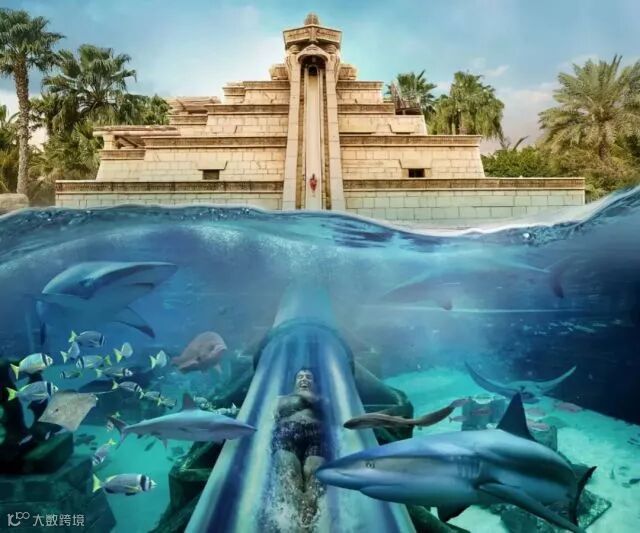 “海神之跃”是亚特兰蒂斯水世界速度最快的项目,没有之一。从25.1米高、75°倾斜的塔顶一跃而下,仅需3秒钟,以自由落体的方式滑入狭窄水道,速度瞬时可达20.2米/秒,滑道底端既是生活着数十只鲨鱼的鲨鱼池。
