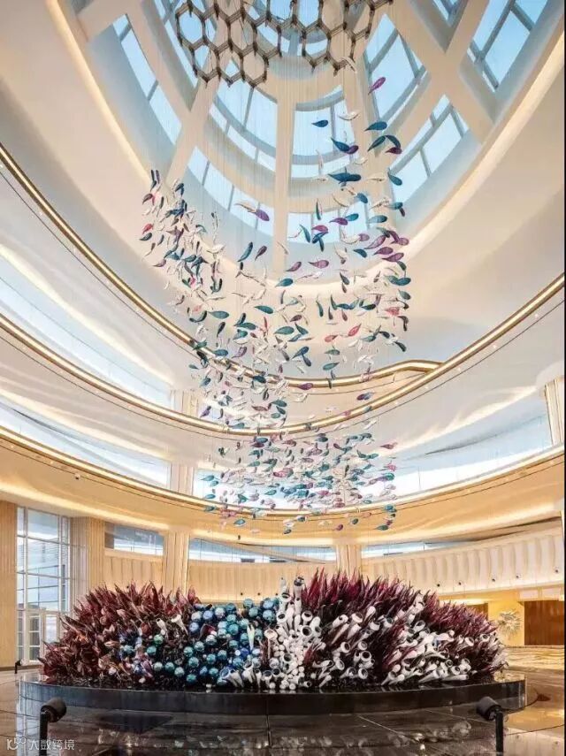 大堂顶部设计以海浪和漩涡为灵感,运用各式材质创造出潮汐的奇特景象,以致敬大海之美
