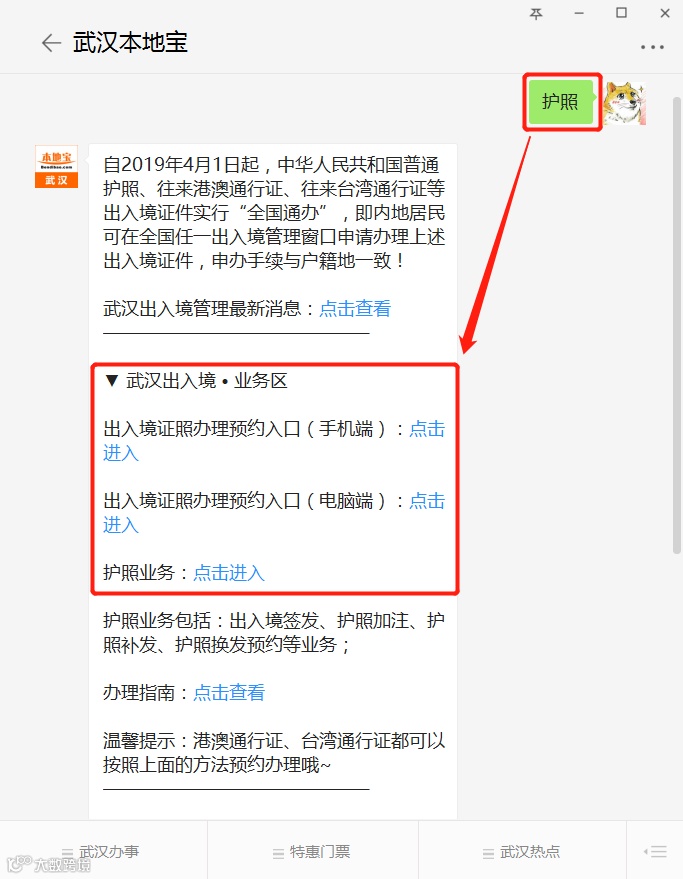 关注“武汉本地宝”,微信对话框回复【护照】在线预约护照办理,查看护照办理指南!