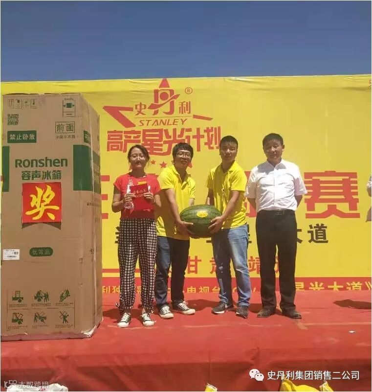 西北总经理张总与品牌中心总经理左总一起为瓜王比赛二等奖颁奖。颁发荣誉证书,奖杯,洗衣机。