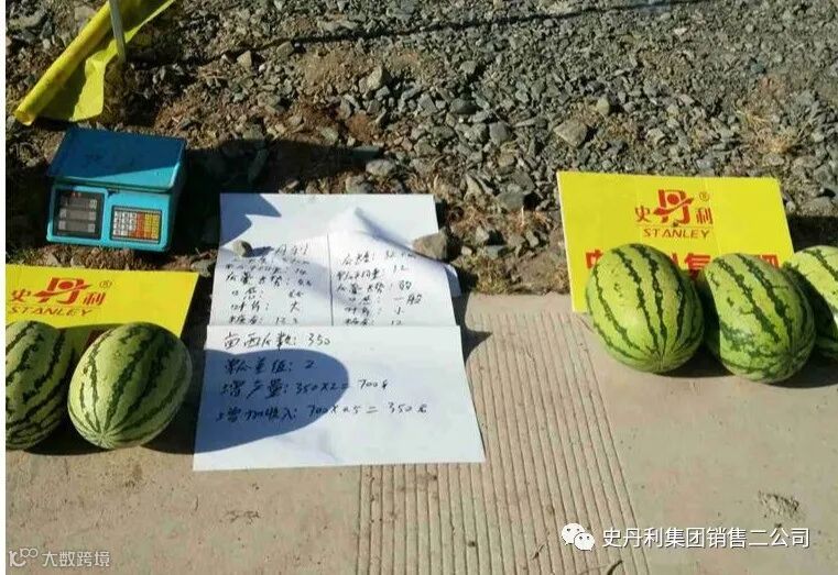 增产效果明显,从西瓜的长势,叶片的大小,西瓜的糖度、重量,现场测产,对比。史丹利复合肥更好技术更好肥效,用事实说话。