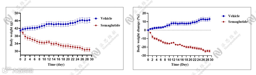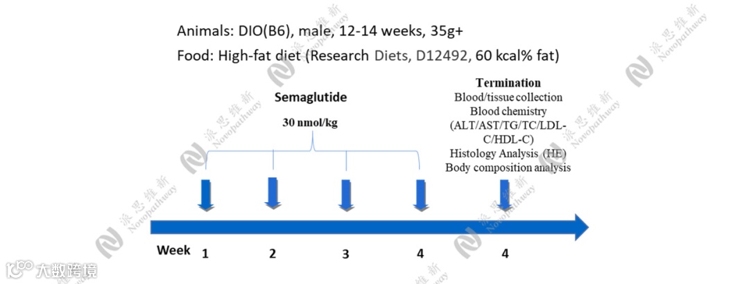 DIO小鼠:SPF级雄性C57BL/6小鼠,60%高脂饲料喂养8-12周。通常8周后体重平均增长率>50%,模型稳定(11-18周)。表型:体重显著增加,伴血糖、血脂升高及肝功能异常。