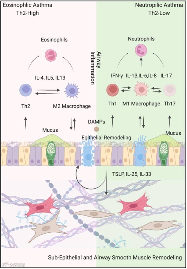 中性粒细胞性哮喘[6]:以中性粒细胞为主要效应细胞,是Th2-low型哮喘的重要表型,常见于重症哮喘、吸烟相关哮喘及感染诱发的哮喘。其发病机制主要涉及Th1和Th17淋巴细胞以及M1型巨噬细胞的活化。这些免疫细胞分泌并募集相关的促炎因子(如IFN-γ, IL-17, IL-1β, IL-6, IL-8),进而驱动中性粒细胞性炎症反应。活化的中性粒细胞释放弹性蛋白酶、基质金属蛋白酶和活性氧等介质,导致组织损伤、粘液高分泌,并可能参与激素抵抗性和气道重塑的形成。